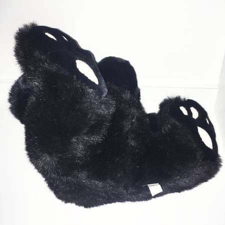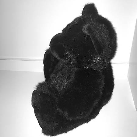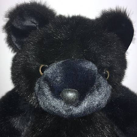 Short hair-like fur rather than plush or felt. Glossy, bead-type eyes, rubbery nose. Feet have faux-leather (probably) pads stitched in. Sitting position.
