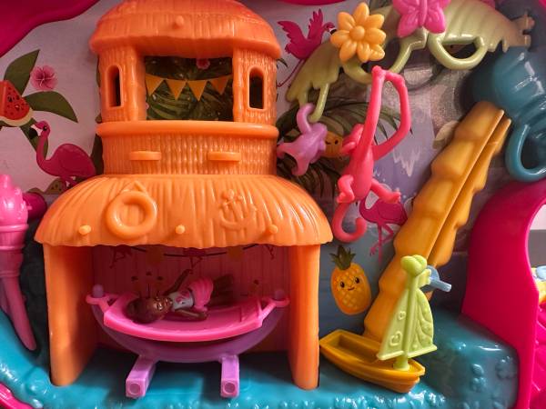 •Fold-out playset with built-in pool, slides, and tropical scenes