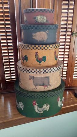 Folk Art Boxes Charming vintage folk art painted boxes with animal designs. Tower = 26” H; Widest box = 14” W Collectible item originally purchased in Great Barrington, MA.