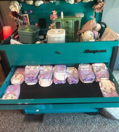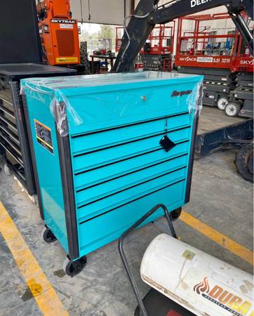 Lightly used snap on roll cart. Turquoise with black trim. Was bought brand new off the truck, unloaded and took home and has been indoors ever since. All drawers work fine. No scratches.