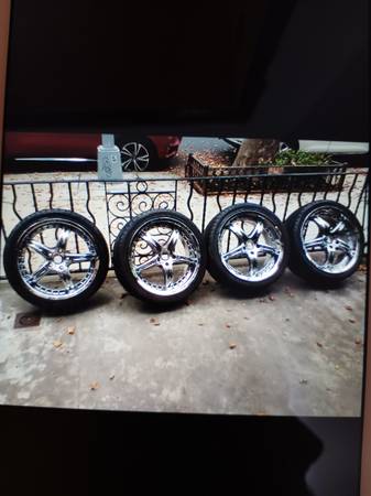 4 5 star "Enkei" chrome wheels with new 225/40/18 crusade tires.These wheels came off my 2015 Dodge charger and gave me a smooth ride.I replaced the old tires with new ones.Asking $600. for set of 4...