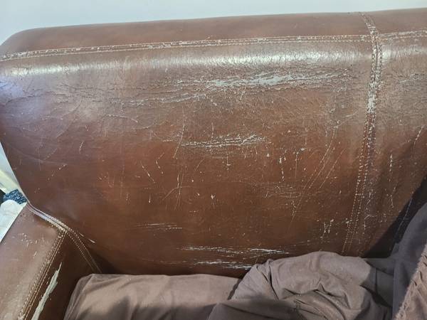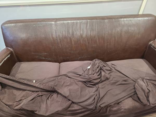 The couch has a probably fake leather that is falling off and is in really bad shape. We have cushion covers available for it for free. The main structure of the couch is in solid condition. The fake leather, as you can see in the pictures is beyond bad.