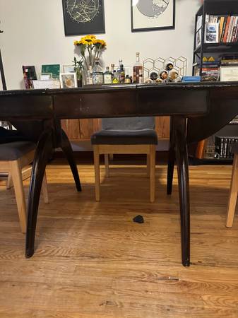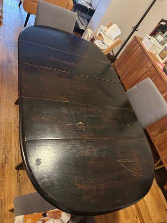 For free - antique solid wood dining table! It’s been painted many times over the years, and has a bunch of scratches and nicks from use. It’s a prime DIY item for a fresh sanding and new look!