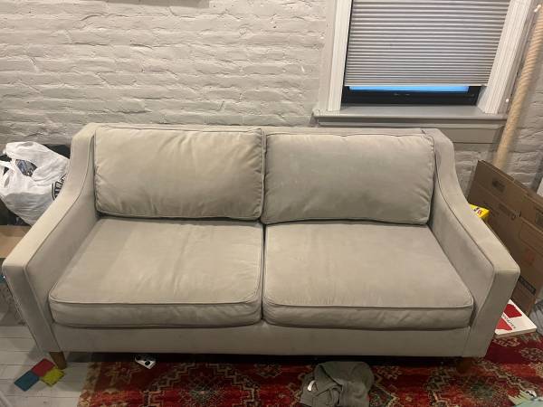 West elm sofa in a gray performance velvet fabric. In generally good condition but could use a good cleaning - we've had it for years but barely used it. 73" x 38". Pick up only, priority goes to...