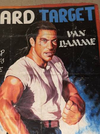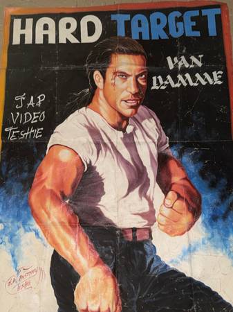 this is a hand painted movie poster from Ghana Africa it is of the movie “Hard Target” starring Jean Claude Van Damme it was painted on a flour sack the artist is known for painting these movie...