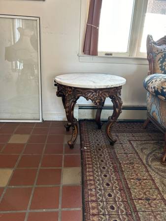 Roma Style Italian living room set, includes one sofa, one arm chair, one loveseat, two marble end tables, one marble coffee table and two Italian Porcelain Capodimonte table lamps, one male one...