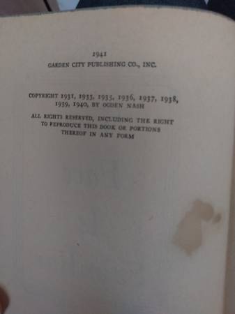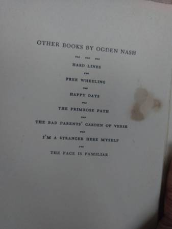 This hardcover book titled "The Face is Familiar" by Ogden Nash is a collection of humorous poems, published in 1941 by Garden City Publishing Co. The author chose them himself at the time, including some new ones. He was known as America's light-hearted laureate.
