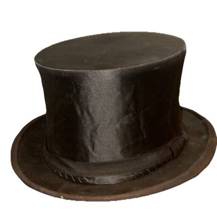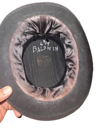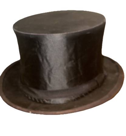 this is an antique collapsible top hat inside there is some writing that’s says Baldwin which I’m assuming is the brand and 6 3/4 which I’m assuming is the size it has wear but still in decent shape for its age. It’s rather small for my head as you can see in the photo, if you are interested let me know.