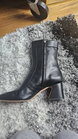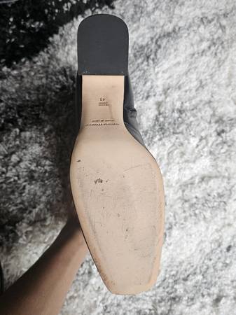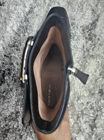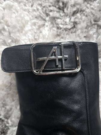 These Alberta Ferretti Sz 41 Black Leather Chunky Heel Boots with a Silver Logo Buckle are a stylish and versatile choice for any occasion. With a round toe shape and a high block heel, these boots offer both comfort and fashion. Crafted in Italy with black leather, they feature a unique silver logo buckle accent that adds a touch of luxury. Worn only twice.
