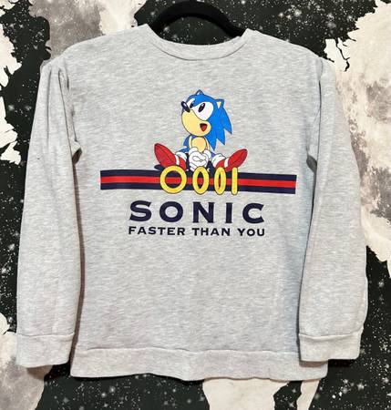 Sonic The Hedgehog ‘Faster Than You’ quote golden rings sweatshirt, color is gray with front video game cartoon character graphic & lettering. Preowned condition Sz. Large Youth Measurements...