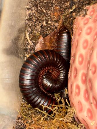Archispirostreptus gigas is the scientific name for the Giant African Millipede, the largest species of millipede, native to the rainforests of western Africa. These nocturnal arthropods are detritivores, feeding on decaying plant matter, and can grow up to 15 inches long. They are characterized by their dark, rounded, segmented bodies, with four legs per segment, and a total of 300 to 400 legs