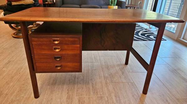H.C. Anderson Rosewood MCM Executive Writing Desk attributed to Kai Kristiansen designer from 1950s. 4 floating drawers and display in front of privacy panel. Original finish, light wear surface scratches, enjoy in vintage condition or refinish. 26" deep by 50" wide, 28" tall, seating area 23" wide, 27" high.