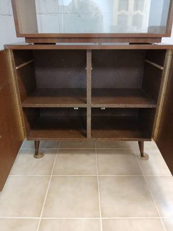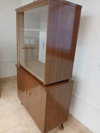 2 piece cabinet Glass display case on top with sliding glass doors. One shelf and back missing. Storage cabinet on bottom Used condition 35" wide 16 1/2" deep 62" tall