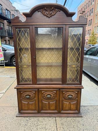 The cabinet is perfect for storing glasses, ceramics, or anything you wish to display, and the glass cabinet protects the items inside from dust. There are also compartments at the bottom for more storage. There is a light bulb inside, where the glass cabinet is, great for showcasing or just making sure that getting things out of the cabinet is safer. It’s been used but the wood is still in great shape, so is the glass, and everything else.