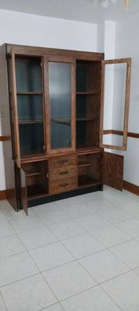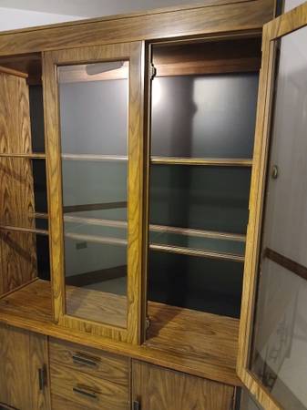 Wooden china cabinet. Glass shelves with wooden frame. Light bulb inside Very good condition W: 4' 6" H: 6' 6" D: 1' 6"