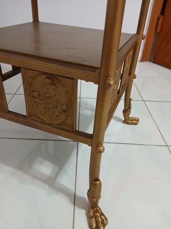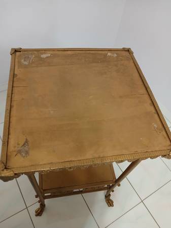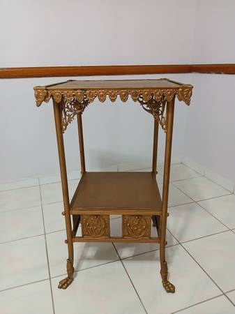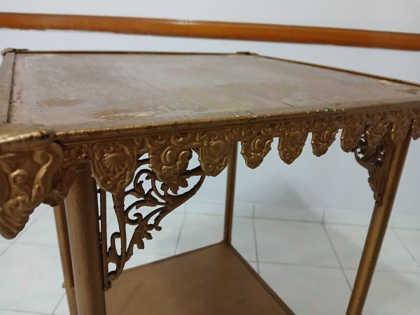 2-tier ornate table Metal frame with wooden table surfaces 32 1/2" tall 19" x 19" square