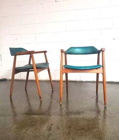 This is an original mid century Danish arm chair pair in the design manner of Erik Kirkegaard. The form is superb with striking presence and notable craftsmanship with quality materials. The outward curving backrest is balanced by the absence of any visible side stretcher bars-adding to the atomic, floating posture of strongly angled legs.. The structural integrity is solid. Originally fabric or a different pleather, clearly reupholstered (decades ago) with the present, late 60's, teal-colored vinyl upholstery; intact and well ready for upgraded fabric reupholstery.