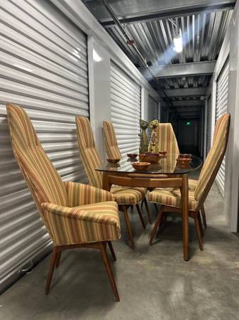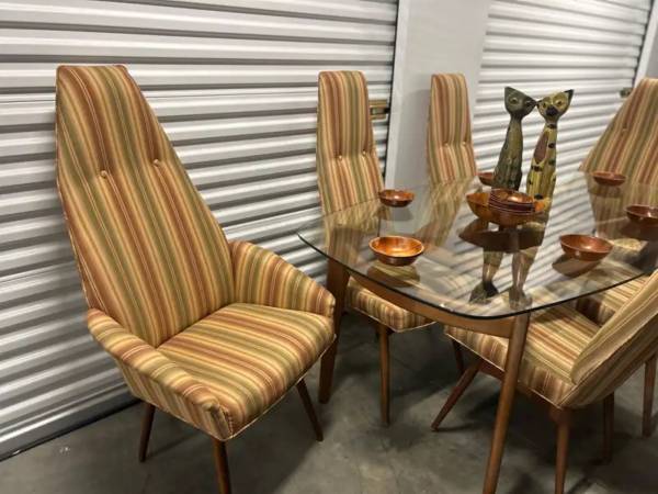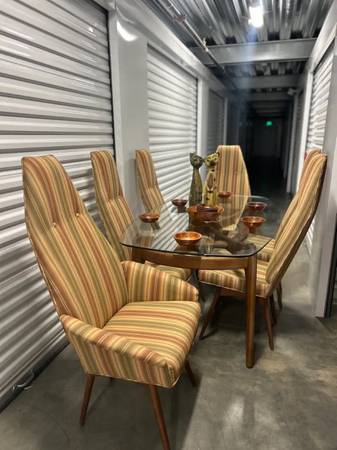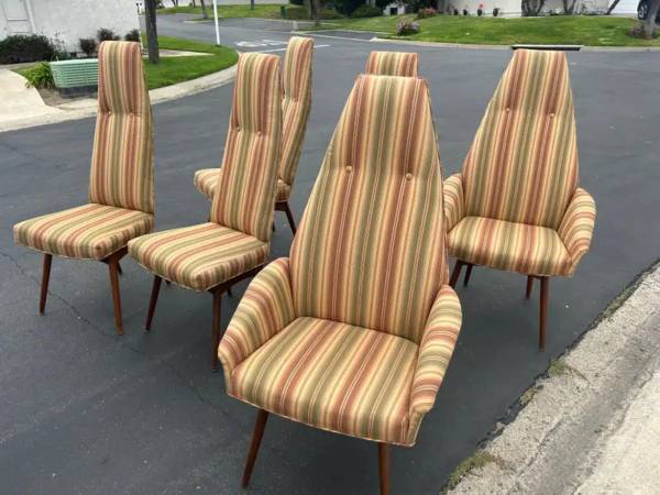 This is an incredible COMPLETE dining set by Adrian Pearsall for Craft Associates. Not often will you find the larger table and 6 chairs as a set. It includes Pearsall's rectangular "Compass" dining table and six of his high-back dining chairs - 2 captain and 4 armless chairs.