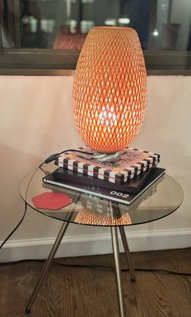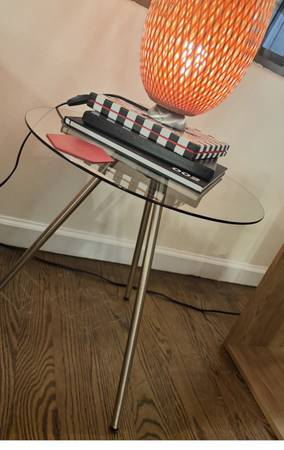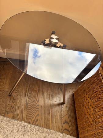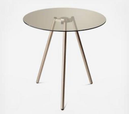 Zola Round brown glass side table with metal cooper legs new, 20”x 20”