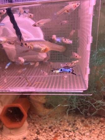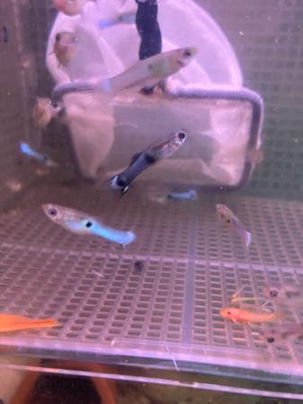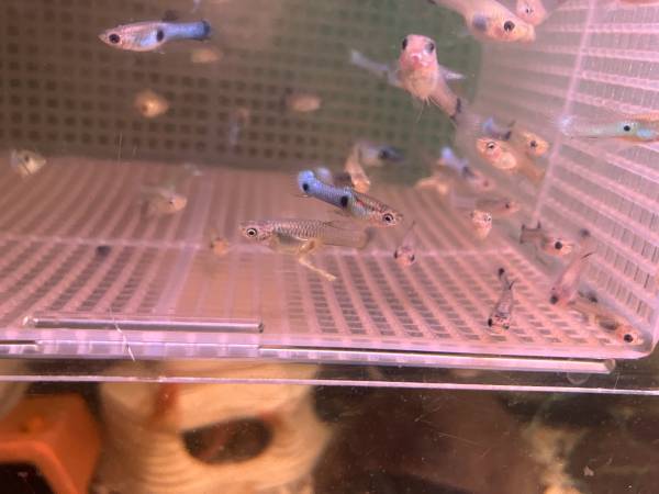 I have a nice trio of Japan Blue Endler / Guppy Hybrid culls ( 1 male and 2 female ) from my Japan Blue Midnight project. Some males are just getting color and some have color but they are not full grown. They are 1" to 1.5" in size. The pictures are young adult males from my young breeding group that have not fully developed tails. The males you will get will vary once fully developed. Some will have bottom swords, double swords or no swords. They are 15 bucks a trio ( 1 male and 2 females ) . Take 2 trios ( 2 male & 4 females ) for 25 bucks or 10 or more fish are 3.50 ea