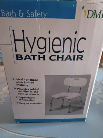 Brand new, never used, although the box is open. This sturdy bath and shower chair will provide welcome relief if you have trouble standing or worries about falling in the shower. Shower with confidence knowing you have a stable place to sit. This bath chair will make showering easier and safer for people with disabilities, older people or those recovering from surgery or injuries. The chair has a comfortable seat with a u-shaped opening for easier personal hygiene care. The back rest is removable, which means you can also use it as a shower stool. The frame is made from aluminum which is strong yet lightweight. And the suction cup rubber tips are slip resistant, giving the chair firm footing on wet surfaces. The height is adjustable from 13 to 17 in.