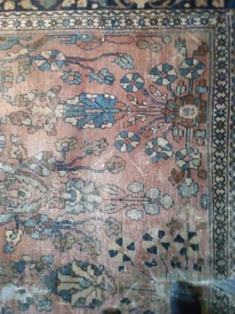 Has many rips and tears but looks great when another rug or sheepskin, cowskin, cowhide, cow hide is layered on top of it. Beautiful colors including blue, rust, green, yellow.