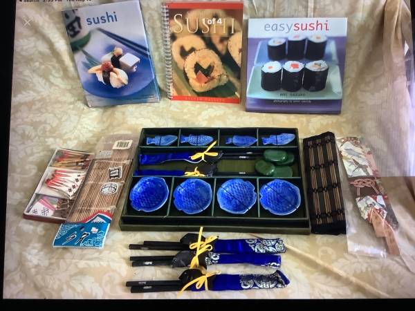 Everything you need to get started with SUSHI.ROLLING MATS, DECORATIVE FLAGS, 3 books, sushi roll maker torpedo tube, chop sticks w/ holders, soy sauce bowls, serving “BOATS”