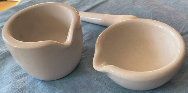 Pestle and two mortars Two mortars: 3"x5.5" and 2.5"x3.5 One pestle. Good shape, no chips or cracks