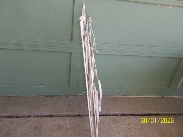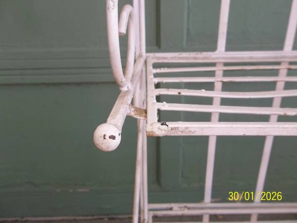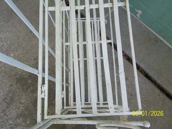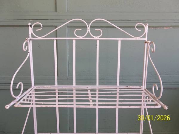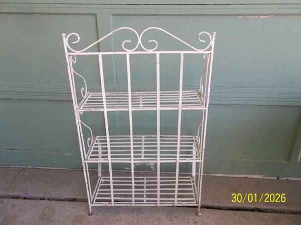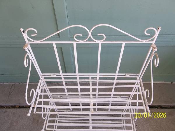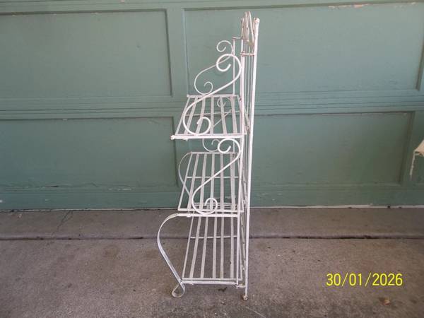 vintage wrought iron 3 tier collapsible folding plant stand/ shelf. 39" tall x 24" wide x 12 1/2" deep. The top shelf is 25", the middle shelf is 14 1/2" and the bottom shelf is 2 3/4" tall. The 3 shelves are 9 1/2" deep. Some minor rust/ corrosion and a few slightly out of shape/ bent areas all as pictured. The middle shelf does not fold as fully as the top and bottom shelf, but still folds fine. I found no broken welds/ pcs. A more thorough cleaning may be needed. Quite heavy and well made. Please view all photos and use them as part of the description and please ask questions before bidding. Thanks.