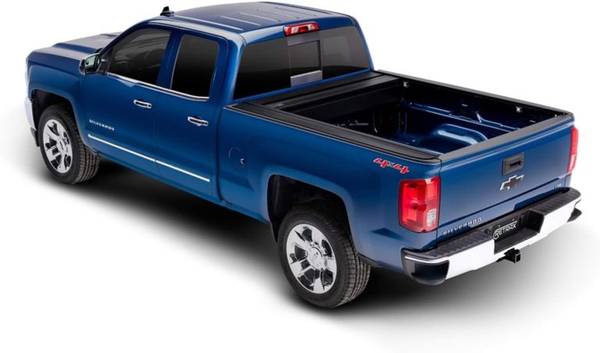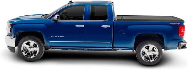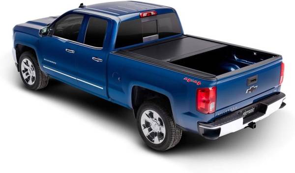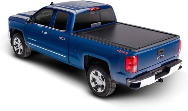 Selling a Retrax PowerTraxONE MX electric retractable tonneau cover in matte black, low-profile design with remote key fob operation. This cover opens and closes at the touch of a button, can lock in any position along the rails, and includes an integrated LED cargo light with auto shutoff for night visibility.
