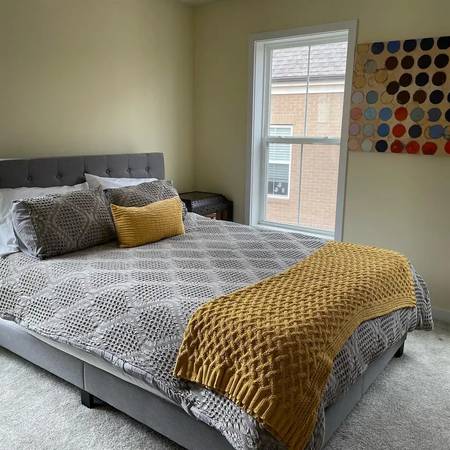 Queen sized bed with drawers, 2 nightstands, large desk with professional office chair, and full length mirror.
