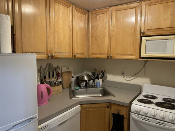 The common areas include the living room and the kitchen which comes with a dishwasher and pantry closet/shelves for food storage. There is also loft space available to store luggage and other large items. There is also a small cat who is very friendly.