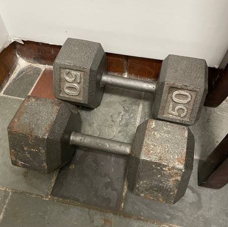I am selling a pair of 50 pound dumbbells that are in good condition, with minor rusting, as seen in photos. Items are located in Throgsneck, Bronx, NY, near East Tremont Ave.