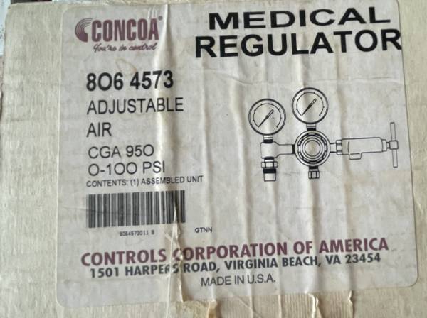 Concoa Gas Regulator, adjustable air CGA-950. 0-100 PSI. Brand NEW, sealed in the original package, with instructions. Ind. Oxygen mix. 50 PSIG, CGA E-4. Not for medical use.