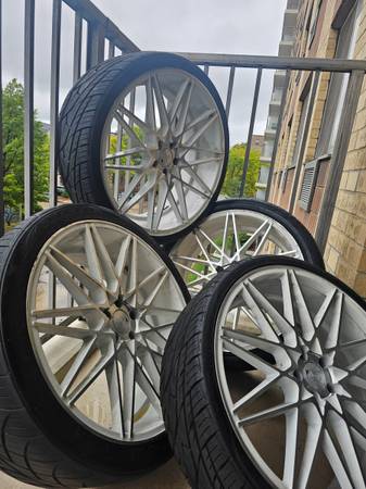 22 INCH- A1V ZX1 STAGGERED WHITE CONCAVE WHEELS WITH SILVER LIP AND FACADE 5x114.3. 5x114.3 WITH 255/30/22 AND 265/35/22 ONLY TWO TIRES ARE GOOD. SET OF FOUR IN EXCELLENT CONDITION GREAT FOR CRV'S...