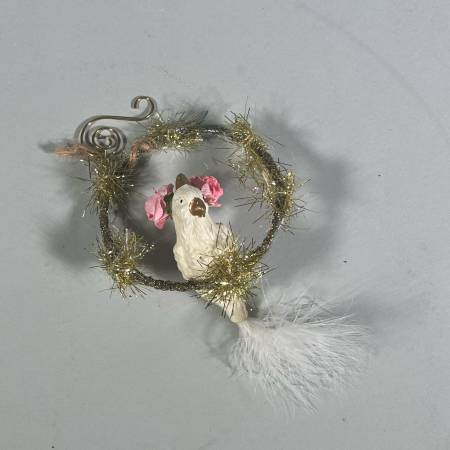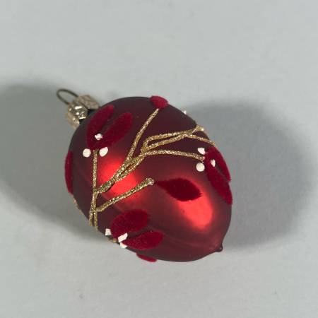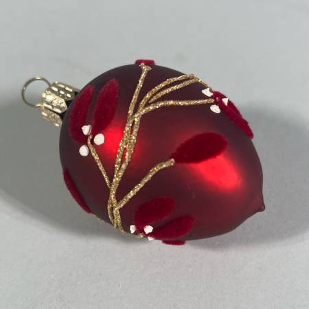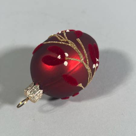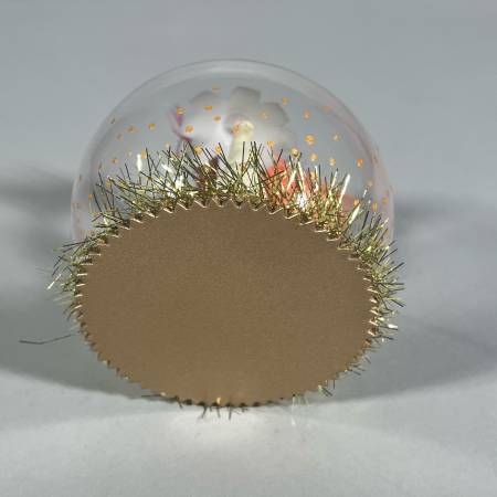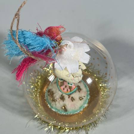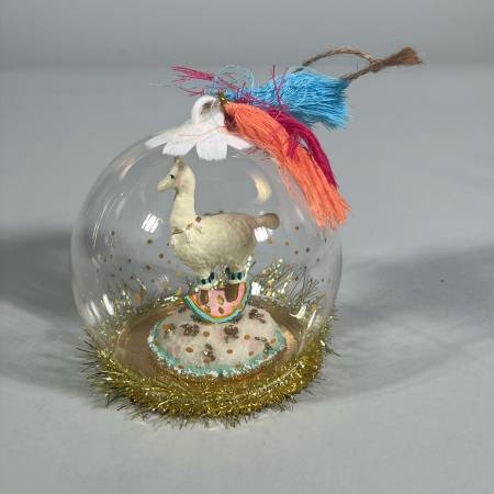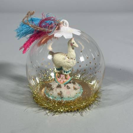 Including a Llama in a clear globe with tassels and gold tinsel trim, a composite parrot with feather tail sitting on a gold round perch, and a small deep red ornament with red velvet adornments and gold sparkles. - h. 4 x w. 4 x d. 4 in. (Llama)