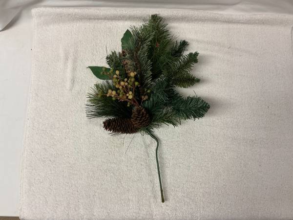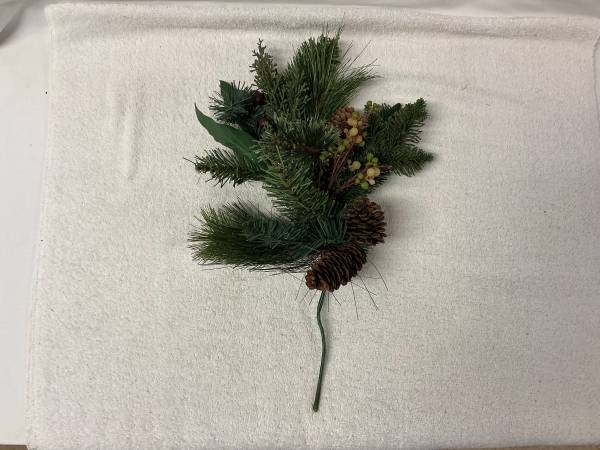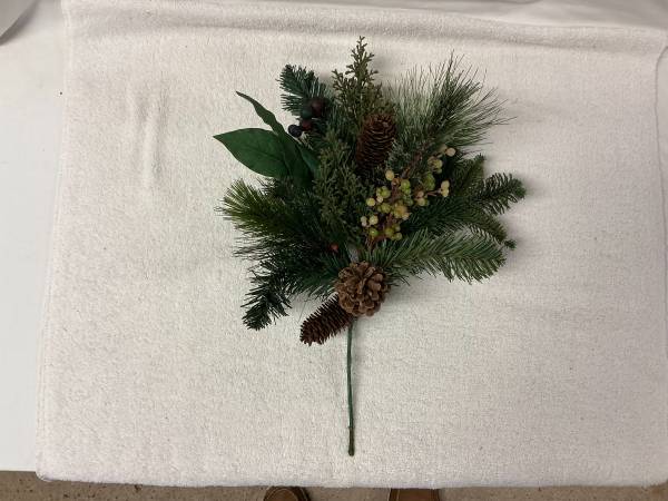 Each stunning bouquet /spray includes artificial white pine, balsam, frasier fir, cedar stems, green leaves, along with white berried branches and real pine cone. The wired stems are beautifully wrapped in green cloth from top to bottom.