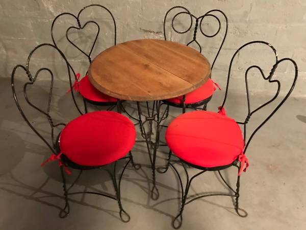 ICE CREAM PARLOR TABLE & CHAIRS 4 METAL CHAIRS WITH CUSHIONS 1 SOLID OAK ROUND TABLETOP WITH METAL LEGS ALL IN VERY GOOD CONDITION