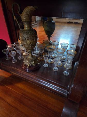 Great for bar, with reflecting shelf for crystal glasses ( shown with St Louis France crystal gilt Thistle Pattern) or for use as hall, dining room or living room console table.