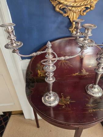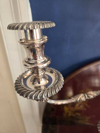 Period, antique ornate Circa 1790 to 1820 Old Sheffield silver plate George III period elegant pair of candleabra, which also can be used as single candlesticks. In the style of Matthew Boulton the candle sockets, base and several other decorative elements. Candleabras of this type are also in the Metropolitan Museum in NY and the Isabella Stewart Gardner Museum in Boston.