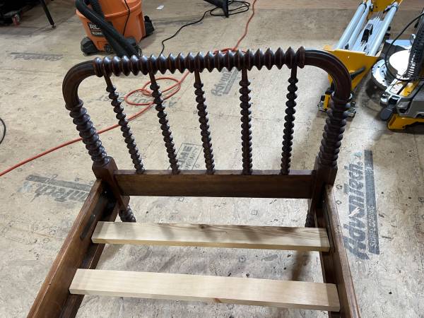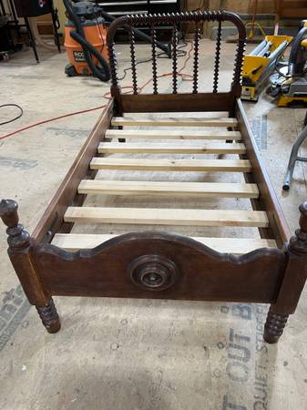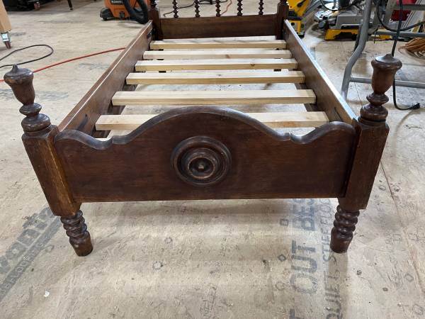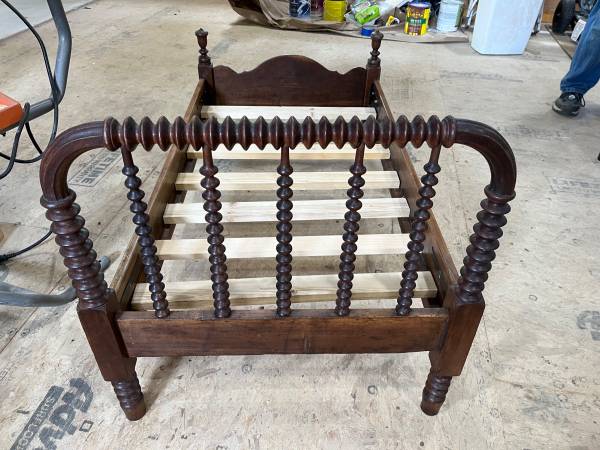 Beautiful antique wooden child’s bed with new cross bars to hold the mattress.