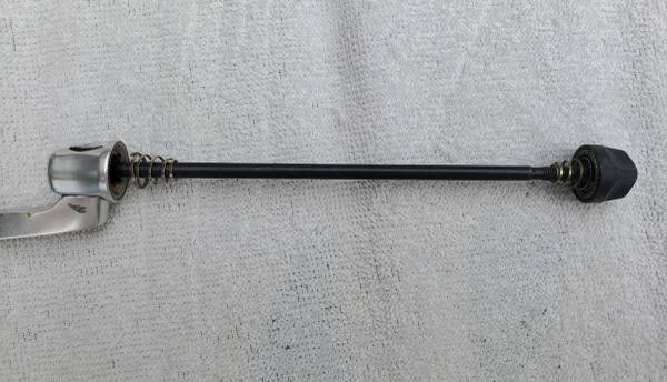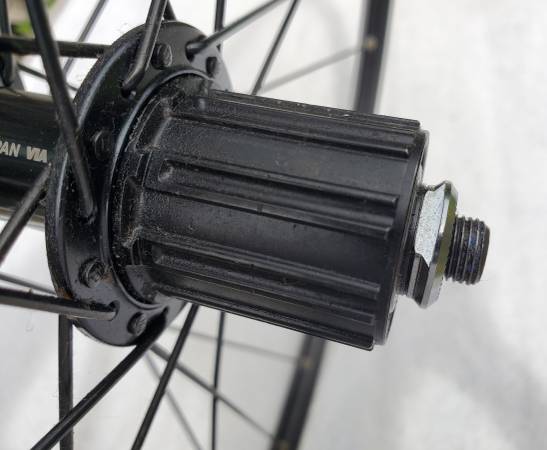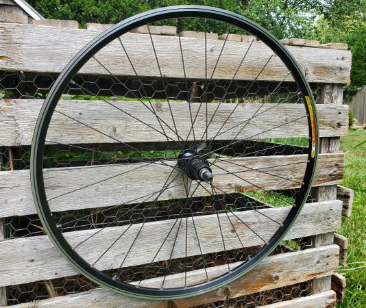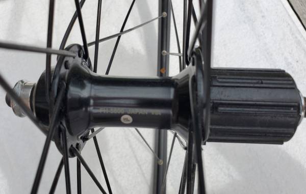 Shimano 9/10 speed rear wheel. 105 hub (FH-5600), 32h, laced to a black Mavic CXP-22 rim with black DT Champion spokes and brass nips. 130mm spacing. Includes skewer. NEW.