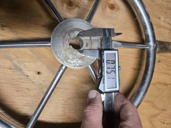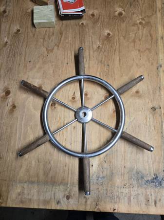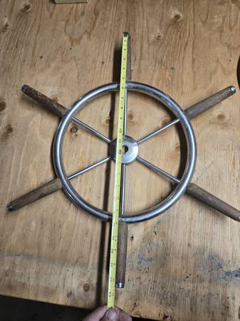 22.5" ship's wheel with wooden hand grips. Rescued from my father inlaw's basement, however, I realize I will likely never use this. Hoping it can find a good home. 3/4" center shaft/ axle. 13.5" OD...
