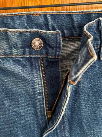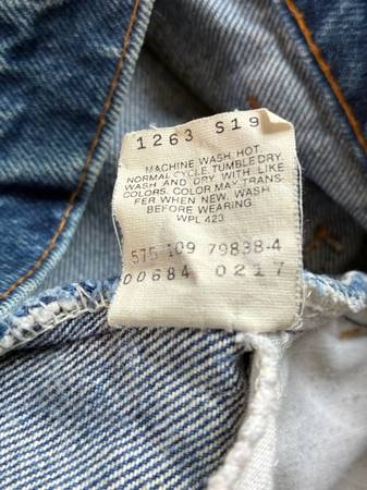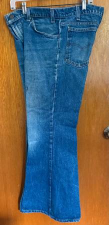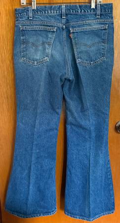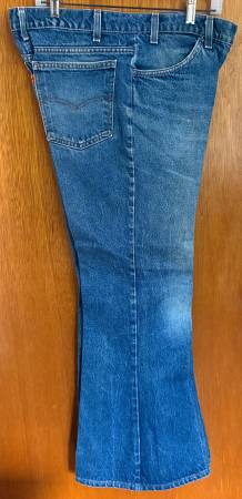 Used vintage Levi's 575 size 36x30 blue denim bell bottom jeans, with official small Levi's orange tab and front metal Levi Strauss button; In very good condition. Shrunk waist seems more like 34...