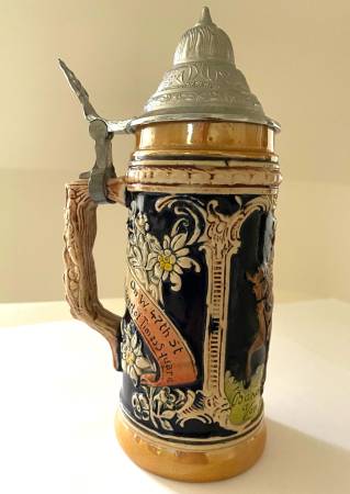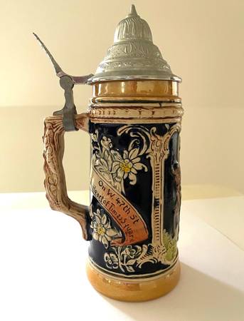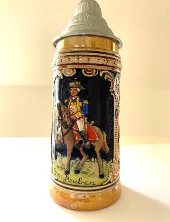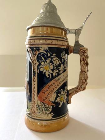 Vintage Lidded Stein Steuben Tavern Times Sq. NYC 1960s Excellent Condition. A half liter stein made in Germany for Steuben Tavern. 6-1/2" tall, 9" high including lid. Great piece of New York City history. Has image of Baron Von Steuben. Tight pewter lid. Scrolls read: "Steuben Tavern Bavarian Gemutlichkeit" and "On W. 47th St. the Heart of Times Square." If you were ever there, you'll want to show off this piece of NYC in the '60s.