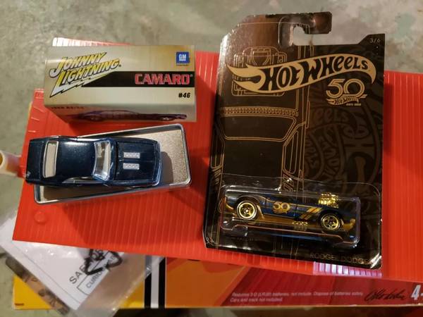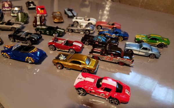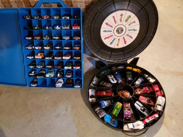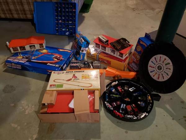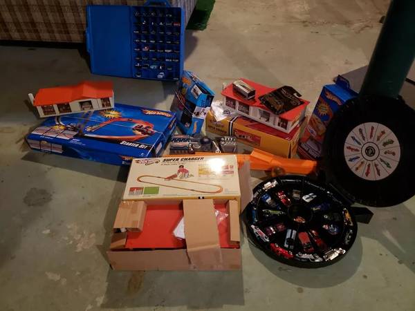 Mattel Hot Wheel Collection. Condition is "Used" but all works great and looks beautiful and new (all parts). Included are 45 cars in rectangular display case, and 24 cars in round wheel display case; (1) Hot Wheels Starter set with track; (3) Shift Control garages with all stickers affixed (takes 3 "D" batteries-not included) ; 4 feet of orange track; (1) 180 degree curve; (1) Speed Junction; (1) power station (takes 2 "D" batteries-not included); (1) Johnny Lightning '68 Camaro; (1) 50th Anniversary unopened Rodger Dodger car; (1) Hot Wheels button; Garages and orange track are vintage, the rest is around 2000. 71 cars total! Local pick up, cash only