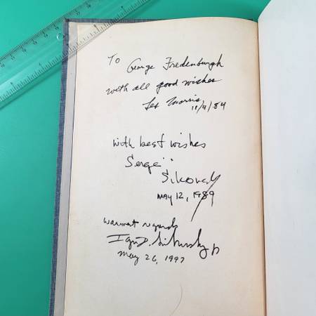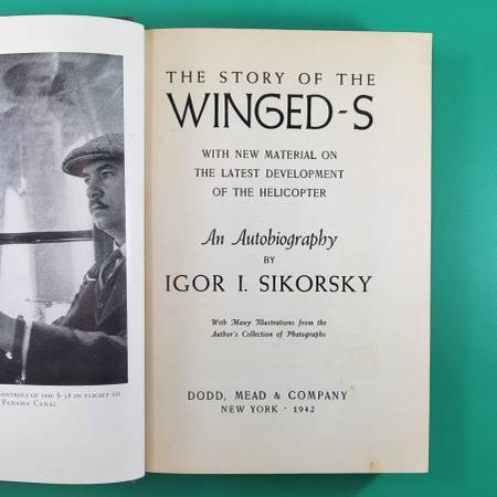 This is a very rare book. Not only is it signed by Igor Sikorsky, it is also signed by Les Morris, Sergei Sikorsky, and Igor Sikorsky Jr.