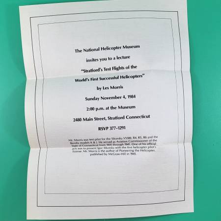 Also included are the letter from the National Helicopter Museum for a lecture by Les Morris and the newspaper obituaries for Les Morris and Dimitry D. “Jimmy” Viner. This is a truly amazing piece of history that will complete your aviation collection.