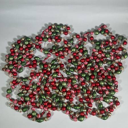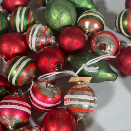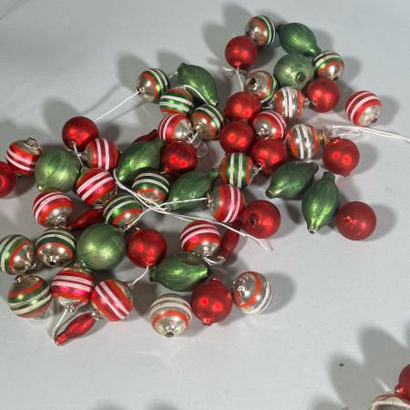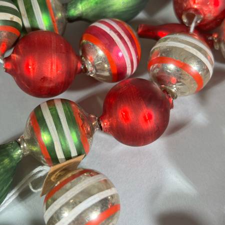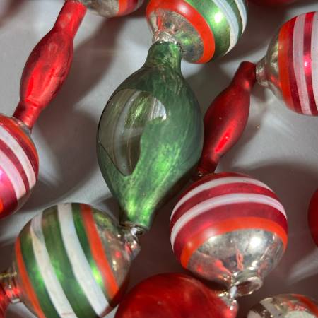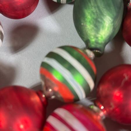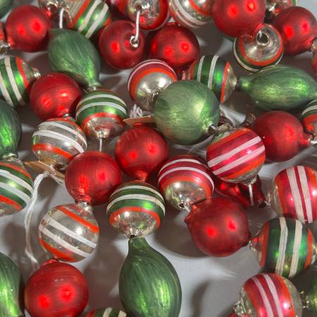 Red and green plain spheres, silver and green globes with white and red bands strung on white string. All glass. One of strings is not a full string and another needs to be restrung. - l. 74 in. (Each string except broken one.)