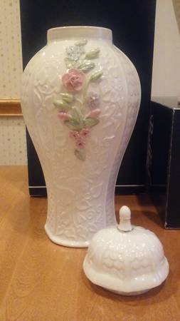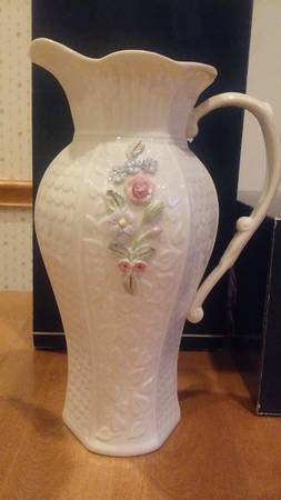 LEFT TO RIGHT 1998 MILLENIUM COVERED VASE 12 INCHES TALL $80 1999 MILLENIUM PITCHER 10 INCHES TALL $70 BLOOMFIELD 104TH ANNIVERSARY VASE $70 ABERDEEN 10 INCH PITCHER $65 ALL NEW WITH BOXES CASH AND...